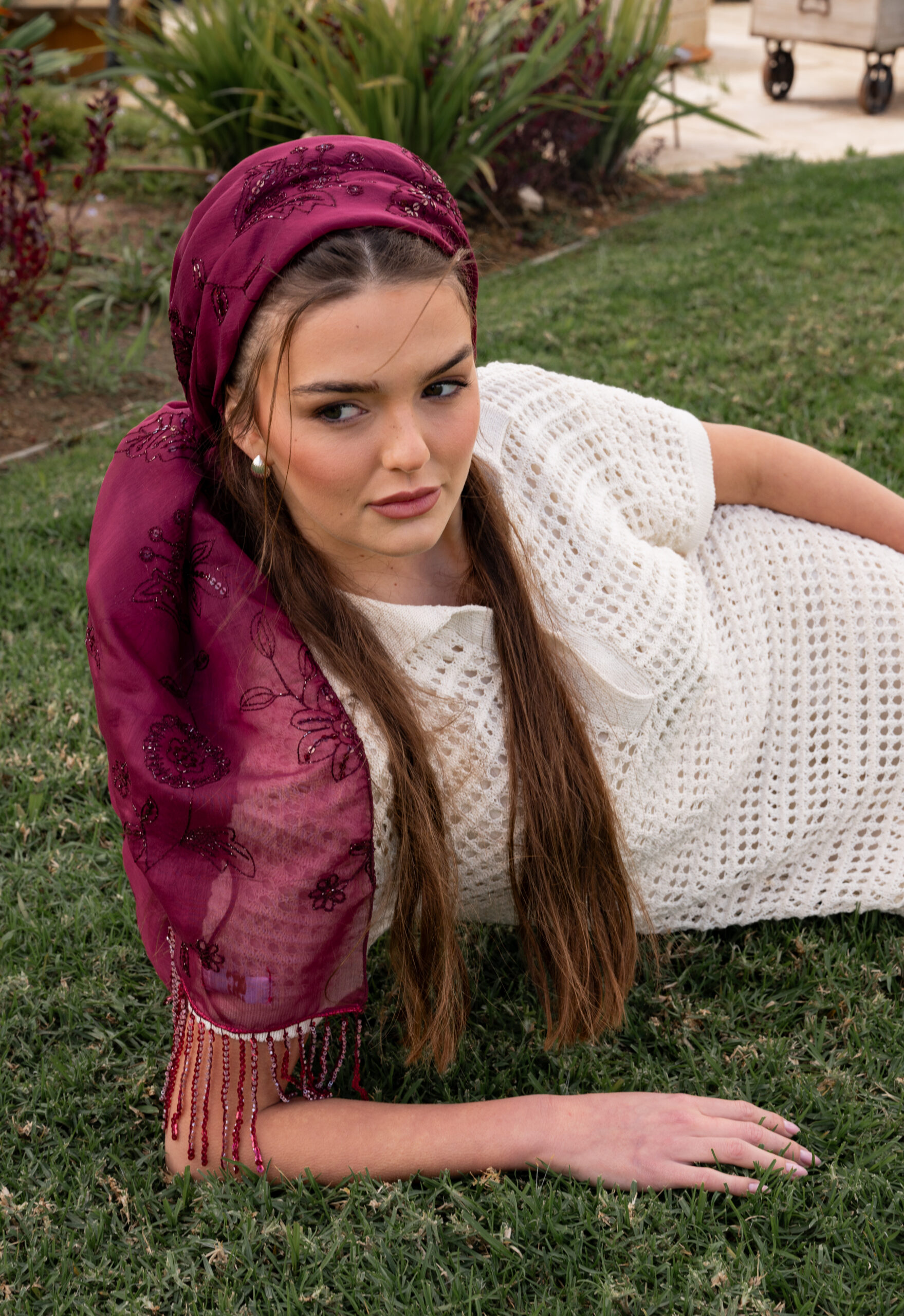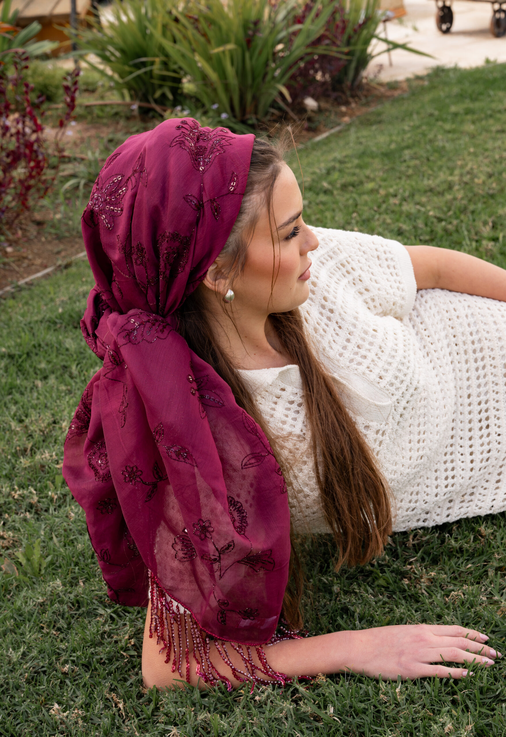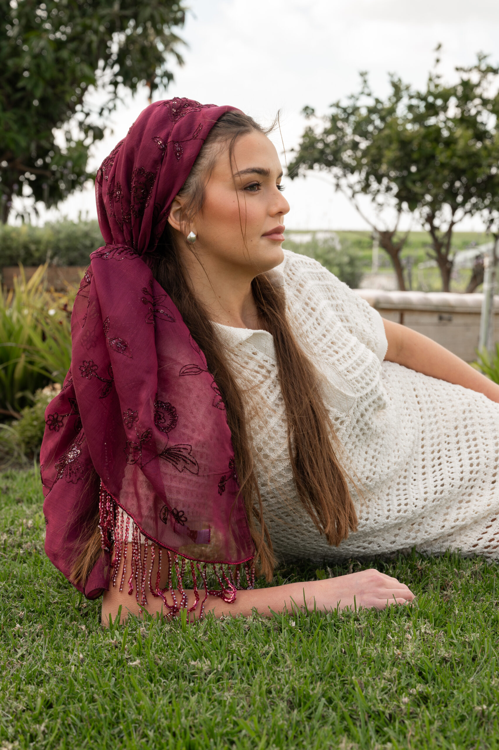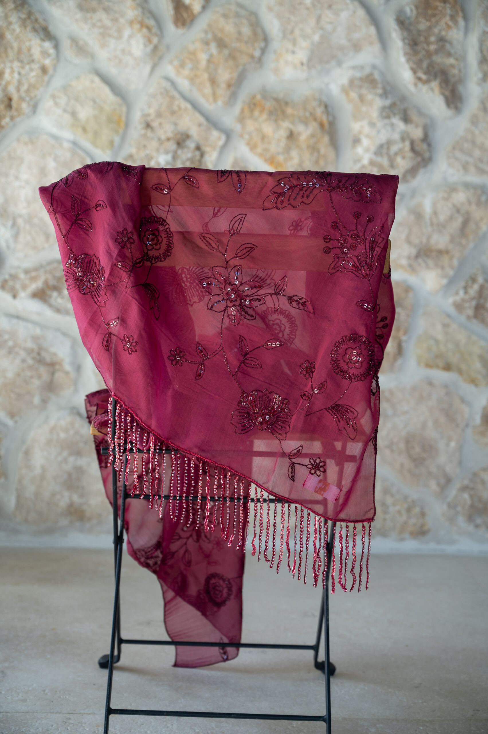 מטפחת בד יציב ונוח מדגם הלל, בצביעה נדירה ומיוחדת בגוון דובדבן מאיר וחי, שלא תמצאי בשום מקום אחר. הטקסטורה עם פייטים עדינים בגוון המטפחת מוסיפה נגיעה נוצצת ועדינה, והפרנזים באותו הגוון לאורך המטפחת משדרים אלגנטיות מושלמת.